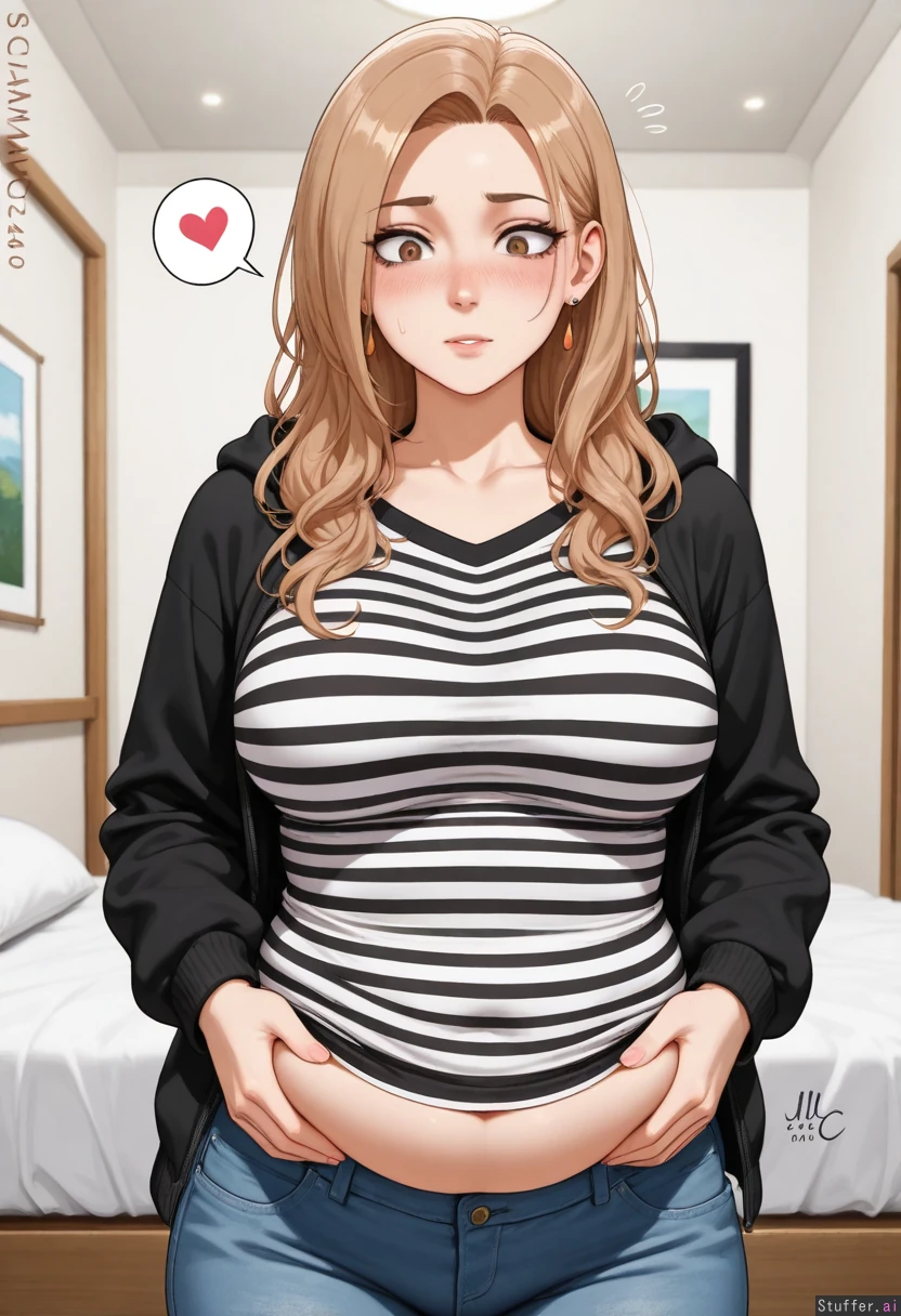 Sciamano240(artist), (solo), young woman, soft oval face, slightly heart-shaped, almond-shaped hazel eyes, slightly hooded eyelids, subtle downturned outer corners, natural medium-thickness eyebrows with soft arch, straight narrow nose, small rounded tip, natural lips (slightly fuller lower lip), light warm-neutral skin tone, smooth natural skin texture, dark blonde/light brown hair with warm highlights, medium-long hair past shoulders, slightly wavy, soft layers, center part, slim petite build, (notable weight gain, very chubby belly bulge:1.2), wearing black cardigan over black-and-white striped shirt, open jeans, casual cozy outfit, soft natural lighting, bedroom, (prodding her soft belly), embarrassed, blushing, shocked,