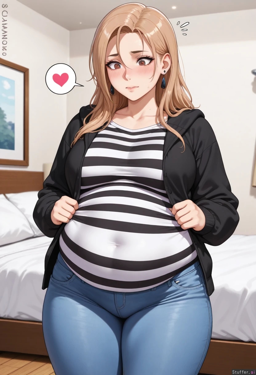 Sciamano240(artist), (solo), young woman, soft oval face, slightly heart-shaped, almond-shaped hazel eyes, slightly hooded eyelids, subtle downturned outer corners, natural medium-thickness eyebrows with soft arch, straight narrow nose, small rounded tip, natural lips (slightly fuller lower lip), light warm-neutral skin tone, smooth natural skin texture, dark blonde/light brown hair with warm highlights, medium-long hair past shoulders, slightly wavy, soft layers, center part, slim petite build, (notable weight gain, very chubby belly bulge:1.4), wearing black cardigan over black-and-white striped shirt, too tight jeans open at top, , casual cozy outfit, soft natural lighting, bedroom, (trying to pull up her tight jeans), embarrassed, blushing, shocked,