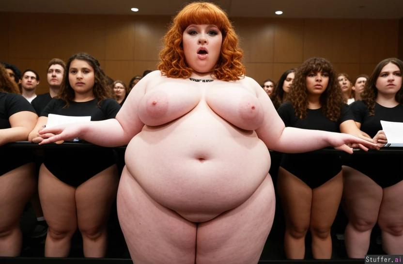 ((Highly realistic:1.9)) (21 year old) (beautiful face:1.2) HD Movie scene ((extremely fat)) Short curly ginger hair with bangs Writing notes in university lecture hall, surrounded by other students. ((fattest woman alive)) ((morbidly obese)) (extremely wide hips) (big bulging belly) ((giant fat oversized udders)) ((extremely fat thighs)) ((thick arms)) short curly ginger hair with fringe (hair with bangs:1.8) (surprised look)