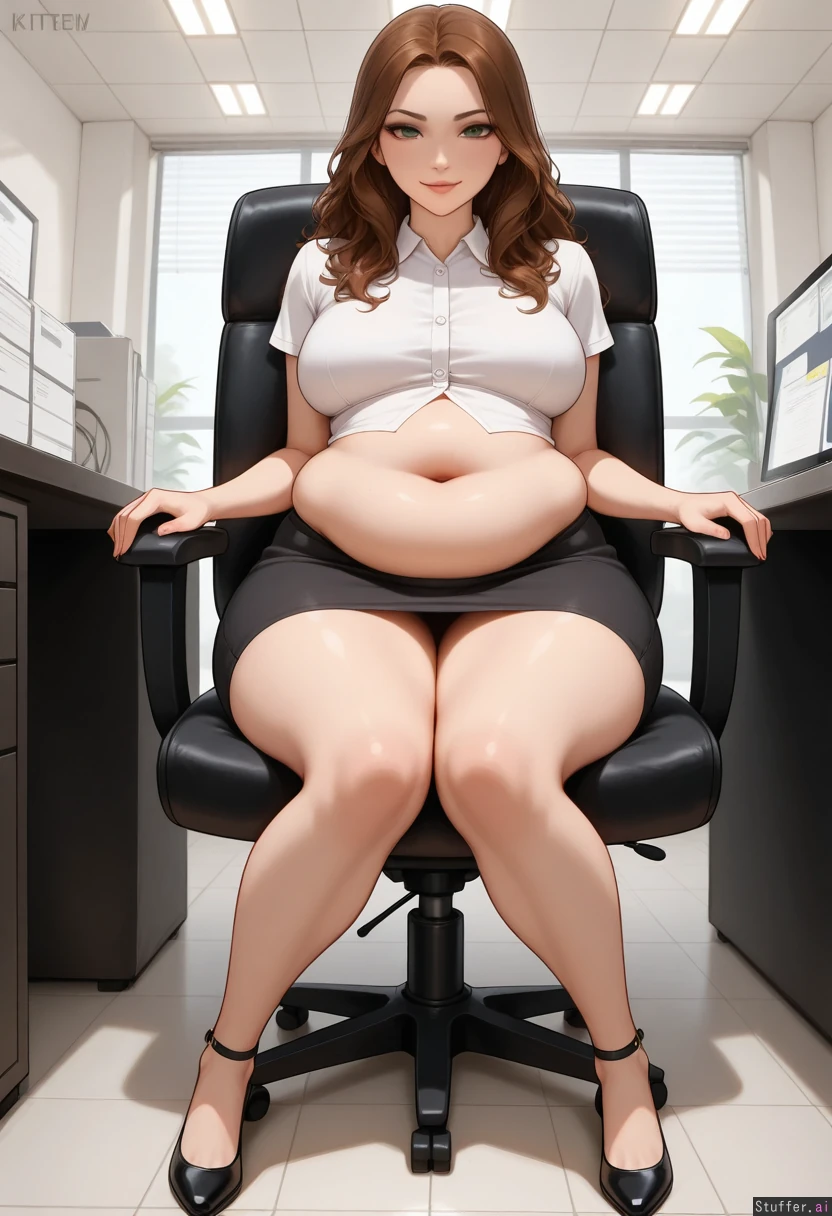 best quality, high quality, full body, detailed face, detailed eyes, kittew(artist), 1 adult woman, 25 years old, receptionist (medium wavy brunette hair, green eyes), (short-sleeve white button-up collared blouse, long black knee-length pencil skirt), (snug and tight clothes), (buttons straining, taut buttons), (slight smirk), (facing right) mid angle shot, big office, white reception desk beside her, sitting in a black office armchair, (day) (massive fat hips, bottom heavy, soft belly:1.4)