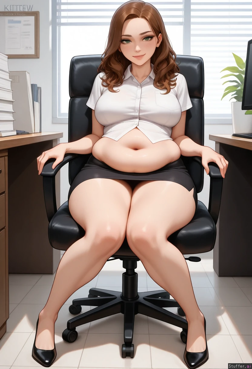 best quality, high quality, full body, detailed face, detailed eyes, kittew(artist), 1 adult woman, 25 years old, receptionist (medium wavy brunette hair, green eyes), (short-sleeve white button-up collared blouse, long black knee-length pencil skirt), (snug and tight clothes), (buttons straining, taut buttons), (slight smirk), (facing right) mid angle shot, big office, white reception desk beside her, sitting in a black office armchair, (day) (massive fat legs, bottom heavy:1.4), (belly rolls, fat belly straining against shirt:1.1)