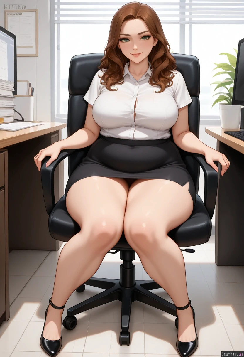 best quality, high quality, full body, detailed face, detailed eyes, kittew(artist), 1 adult woman, 25 years old, receptionist (medium wavy brunette hair, green eyes), (short-sleeve white button-up collared blouse, long black knee-length pencil skirt), (snug and tight clothes), (buttons straining, taut buttons), (slight smirk), (facing right) mid angle shot, big office, white reception desk beside her, sitting in a black office armchair, (day) (massive fat legs, bottom heavy:1.4), (obese:1.1)