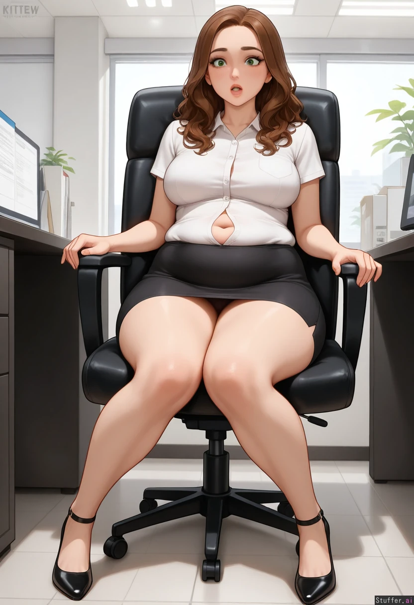 best quality, high quality, full body, detailed face, detailed eyes, kittew(artist), 1 adult woman, 25 years old, receptionist (medium wavy brunette hair, green eyes), (short-sleeve white button-up collared blouse, long black knee-length pencil skirt), (snug and tight clothes), (buttons straining, taut buttons), (shocked), (facing right) mid angle shot, big office, white reception desk beside her, sitting in a black office armchair, (day) (massive fat legs, bottom heavy:1.4), (fat soft belly rolls:1.1)
