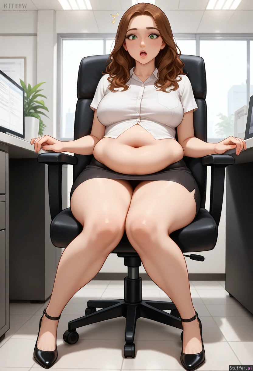 best quality, high quality, full body, detailed face, detailed eyes, kittew(artist), 1 adult woman, 25 years old, receptionist (medium wavy brunette hair, green eyes), (short-sleeve white button-up collared blouse, long black knee-length pencil skirt), (snug and tight clothes), (buttons straining, taut buttons), (shocked), (facing right) mid angle shot, big office, white reception desk beside her, sitting in a black office armchair, (day) (massive fat legs, bottom heavy:1.4), (fat soft belly rolls:1.2)