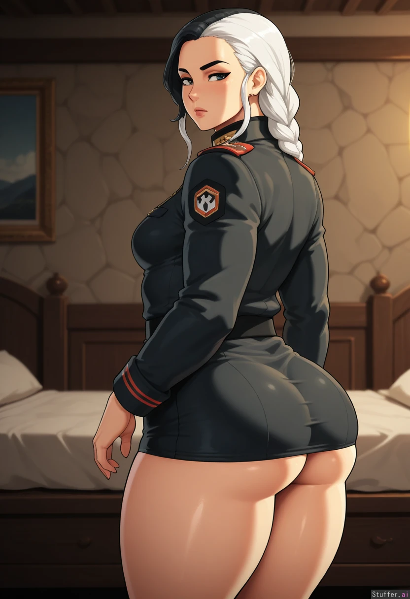 jujunaught, long hair, black hair fades into silver hair, braided hair, tight black military uniform, thin, solo female, stone bedroom background, small_breasts, delicate features, small_ass, small_thighs, small butt,