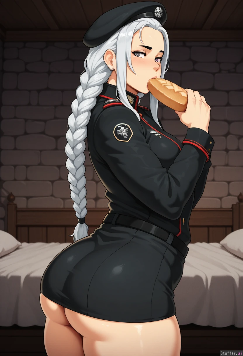 jujunaught, long hair, black hair fades into silver hair, braided hair, tight black military uniform, thin, solo female, stone bedroom background, small_breasts, delicate features, small_ass, small_thighs, small butt, embarrassed, horny, purple_eyes, eating bread, weight_gain