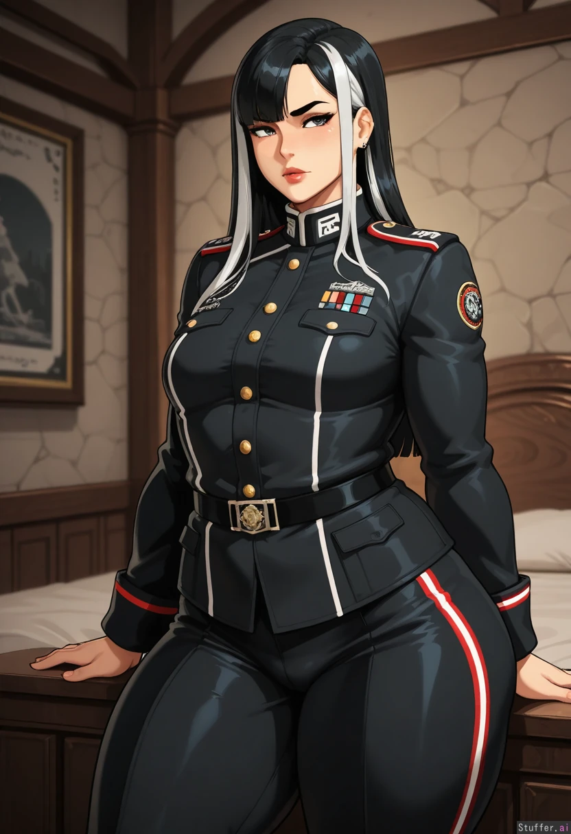jujunaught, long black hair that ends in silver highlights, tight black military uniform, thin, solo female, stone bedroom background, small_breasts