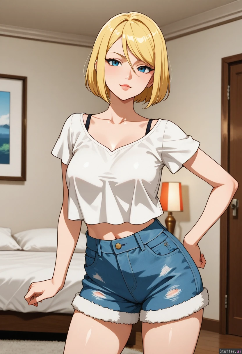 Complex_shading, complex_coloring, female, indoors, solo, alone, seductive_smile, bedroom, fashion, fancy_clothes, supermodel, anime_style:2, smug, anime_coloring:2, detailed_outlines, black_outlines, samus_aran, supermodel, fancy_clothes, posing, half-closed_eyes, crop_top, white_blouse, breast_curtain, fur_trimmed_shorts, short_shorts, thick_eyeliner, long_eyelashes, thicc, alternate_hairstyle, eyeliner, bob_cut, pouty_lips, red_lips, bright_colors, large_collarbone, short_sleeves, bubble_butt,
