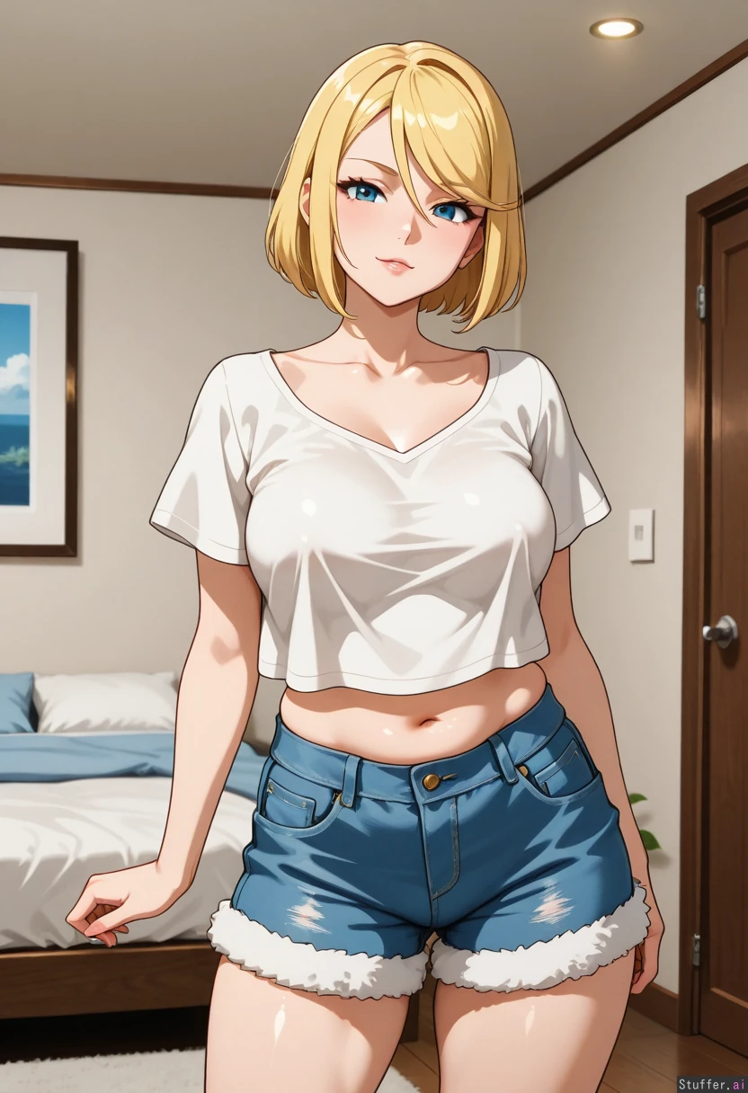 Complex_shading, complex_coloring, female, indoors, solo, alone, seductive_smile, bedroom, fashion, fancy_clothes, supermodel, anime_style:2, smug, anime_coloring:2, detailed_outlines, black_outlines, samus_aran, supermodel, fancy_clothes, posing, half-closed_eyes, crop_top, white_blouse, breast_curtain, fur_trimmed_shorts, short_shorts, thick_eyeliner, long_eyelashes, thicc, alternate_hairstyle, eyeliner, bob_cut, pouty_lips, red_lips, bright_colors, large_collarbone, short_sleeves, bubble_butt, chubby_belly