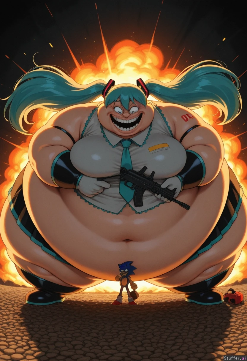 sonic_the_hedgehog_(series), sonic_the_hedgehog, duo, trollface, morbidly obese, explosions, Hatsune Miku, baked beans everywhere, assault rifle, lawnmower,
