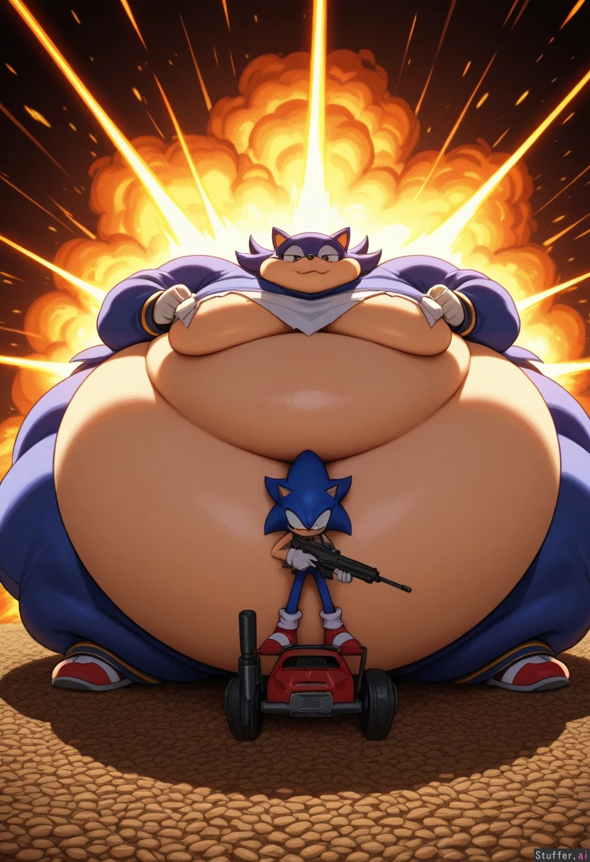 sonic_the_hedgehog_(series), sonic_the_hedgehog, morbidly obese, explosions, baked beans everywhere, assault rifle, lawnmower,