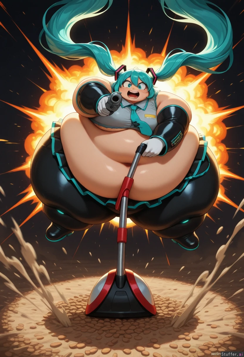 solo, Hatsune Miku, aiming revolver, sonic_the_hedgehog, morbidly obese, explosions, baked beans everywhere, riding lawnmower,