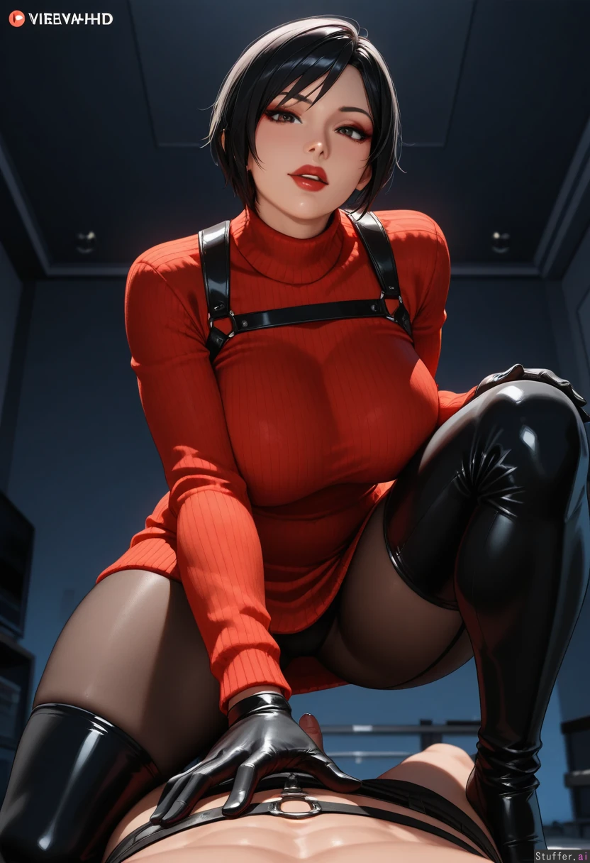 ((Ultra HD)), (( dark lighting )), (photorealistic) Night ((Close up ) pov extreme femdom , on one knee, stepping on dick ), leaning forward Ada_wong, from below , looking at viewer , , (brown eyes, eyeliner , full lips, red lipstick,) Tight Red sweater dress, black harness, black tights , black gloves, thigh high boots (Extremely Curvy, , huge hips, ) Vieny dick Living room ,