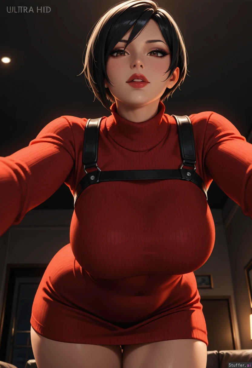 ((Ultra HD)), (( dark lighting )), (photorealistic) Night ((Close up )), leaning forward Ada_wong, from below , looking at viewer , , (brown eyes, eyeliner , full lips, red lipstick,) Tight Red sweater dress, black harness, , black gloves, (Extremely Curvy, , huge hips, ) Living room ,
