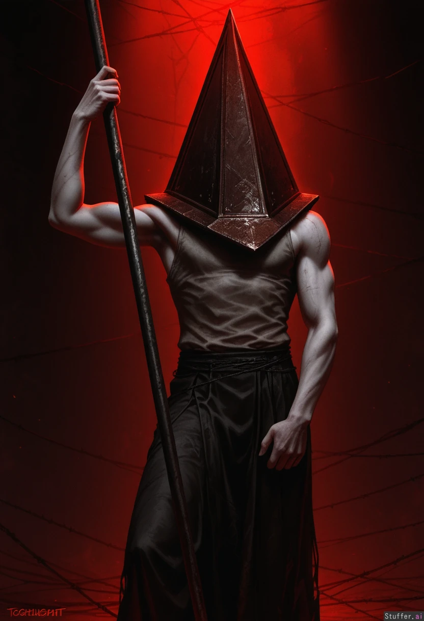Pyramid head, realistic, gritty, dark lighting, silent hill, pole dancing, solo, male, strong, long ragged skirt, very pale skin, dirty, barbed wire, torchlight, red lighting, occult symbols,