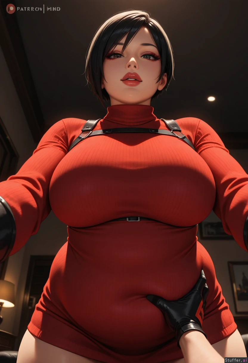 ((Ultra HD)), (( dark lighting )), (photorealistic) Night ((Close up , pov grabbing her belly )), leaning forward Ada_wong, from below , looking at viewer , , (brown eyes, eyeliner , full lips, red lipstick,) Tight Red sweater dress, black harness, , black gloves, ((Extremely Curvy, , , chubby belly )) Living room ,