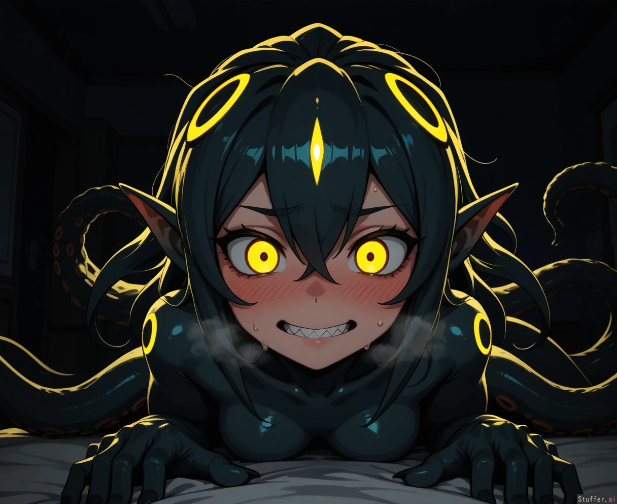 Solo, monster girl, made of tentacles, made of rubber, staring, sharp teeth, sweatdrop, bedroom, dark lighting, glowing yellow eyes, blushing, needy, visible breath