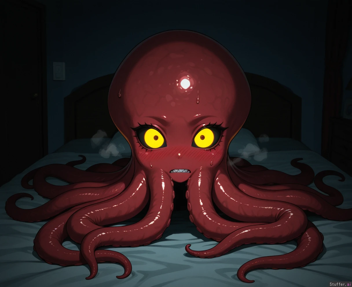 Solo, monster girl, made of tentacles, made of rubber, staring, sharp teeth, sweatdrop, bedroom, dark lighting, glowing yellow eyes, blushing, needy, visible breath, octopus girl