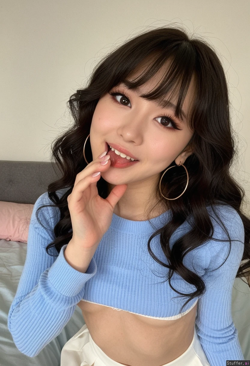 Kpop Korean woman with long dark wavy hair with bangs , a lot of eyeliner, a lot of dark eyeshadow, wearing light blue crop top sweater and white skirt and hoop earrings in a bedroom (Very Slim ) smile Sultry pose Tongue out Hand touching cheek Eyes begging Horny eyes (Fat_belly: 0.5) Big eyes (Eyeliner)