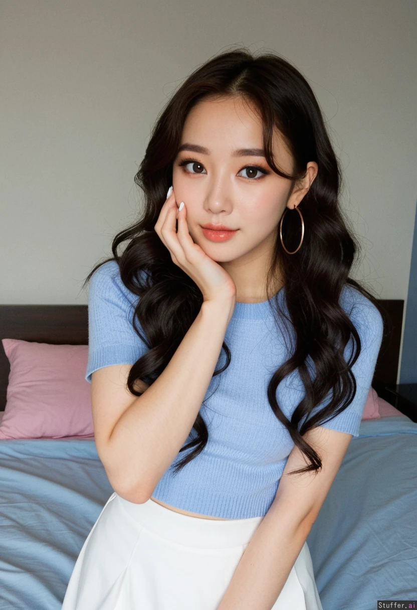 Kpop Korean woman with long dark wavy hair , a lot of eyeliner, a lot of dark eyeshadow, wearing a short sleeve light blue sweater and white skirt and hoop earrings in a bedroom (Very Slim ) Slight smile Sultry pose Eyes begging Horny eyes Hand touching cheek Big eyes (Eyeliner) Standing (Plump)