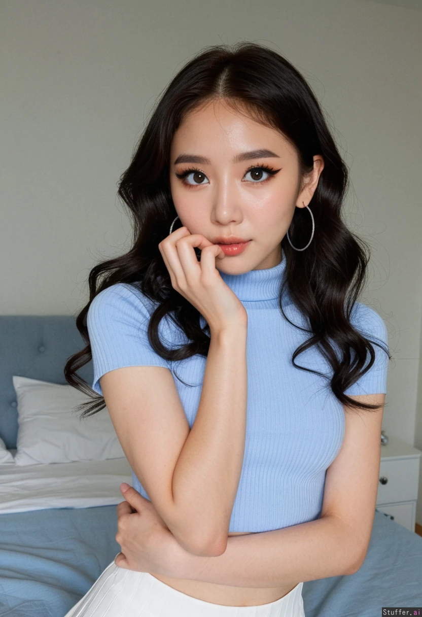 Kpop Korean woman with long dark wavy hair , a lot of eyeliner, a lot of dark eyeshadow, wearing a short sleeve light blue cropped ribbed turtleneck sweater and white skirt and hoop earrings in a bedroom (Very Slim ) Slight smile Sultry pose Eyes begging Horny eyes Hand touching cheek Big eyes (Eyeliner) Standing