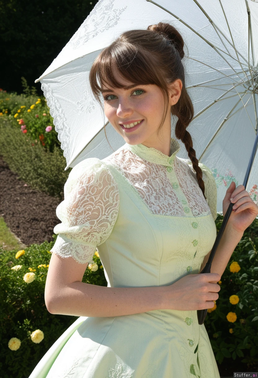Hyper realistic, extremely beautiful 25 year old european girl, garden full of flowers, brunette hair,weavyponytail with side bangs, green eyes, skinny, bright smile,sunny day, victorian pale green era dress, victorian era umbrella