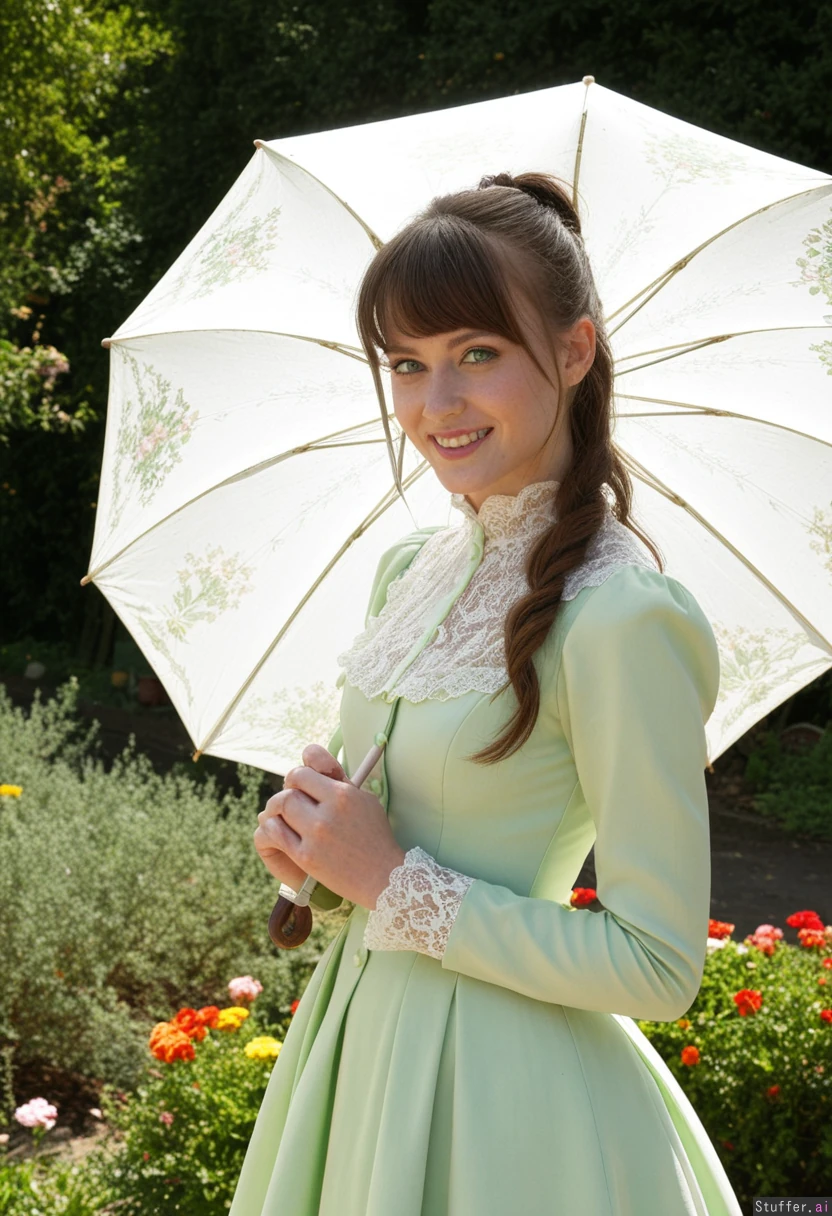 Hyper realistic, extremely beautiful 25 year old european girl, garden full of flowers, brunette hair,weavyponytail with side bangs, green eyes, skinny, bright smile,sunny day, victorian pale green era dress, victorian era umbrella