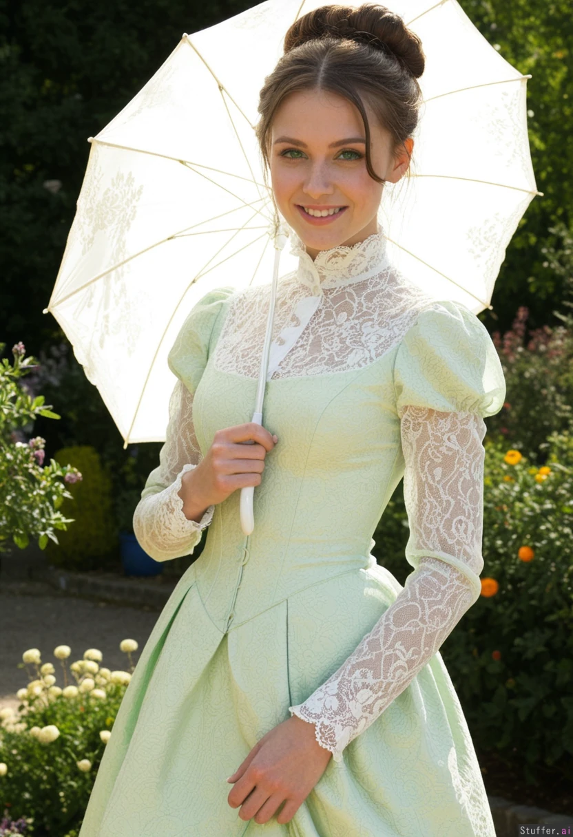 Hyper realistic, extremely beautiful 25 year old european girl, garden full of flowers, brunette hair victorian hairstyle, green eyes, skinny, bright smile,sunny day, victorian pale green era dress, victorian era umbrella