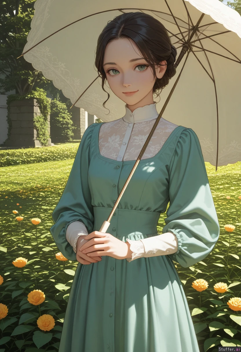 Masterpiece, best_quality, beautiful, cozy colors, , (1girl), HDR, intricate detail, sophisticated detail, detailed textures, best lighting, full color, haptic style Hyper realistic, extremely beautiful 25 year old european girl, garden full of flowers, brunette hair victorian hairstyle, green eyes, skinny, bright smile,sunny day, victorian pale green era dress, victorian era umbrella