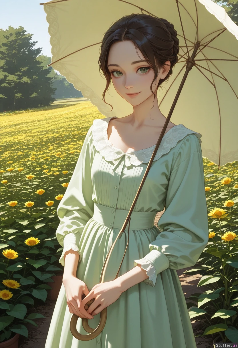 Masterpiece, best_quality, beautiful, cozy colors, , (1girl), HDR, intricate detail, sophisticated detail, detailed textures, best lighting, full color, haptic style Hyper realistic, extremely beautiful 25 year old european girl, garden full of flowers, brunette hair victorian hairstyle, green eyes, skinny, bright smile,sunny day, victorian pale green era dress, victorian era umbrella