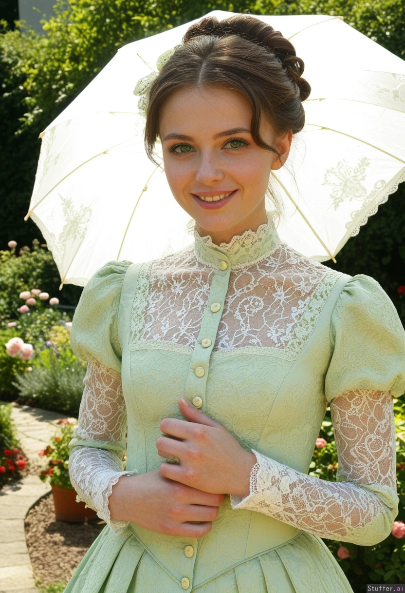 Masterpiece, best_quality, beautiful, cozy colors, , (1girl), HDR, intricate detail, sophisticated detail, detailed textures, best lighting, full color, haptic style Hyper realistic, extremely beautiful 25 year old european girl, garden full of flowers, brunette hair victorian hairstyle, green eyes, skinny, bright smile,sunny day, victorian pale green era dress, victorian era umbrella