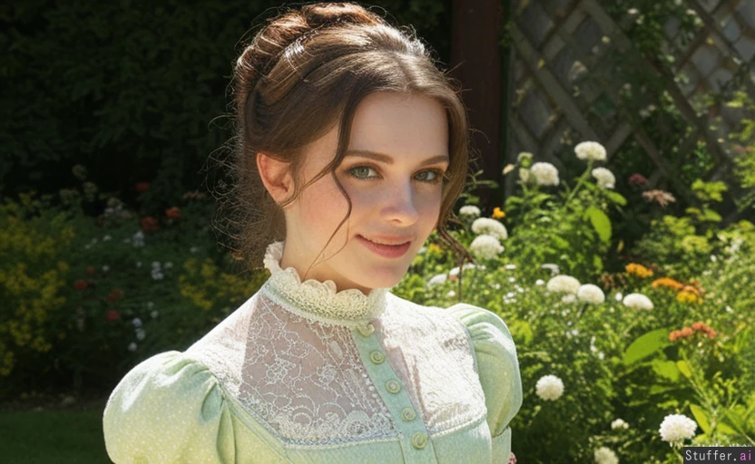 Masterpiece, best_quality, beautiful, cozy colors, , (1girl), HDR, intricate detail, sophisticated detail, detailed textures, best lighting, full color, haptic style Hyper realistic, extremely beautiful 25 year old european girl, garden full of flowers, brunette hair victorian hairstyle, green eyes, skinny, bright smile,sunny day, victorian pale green era dress,