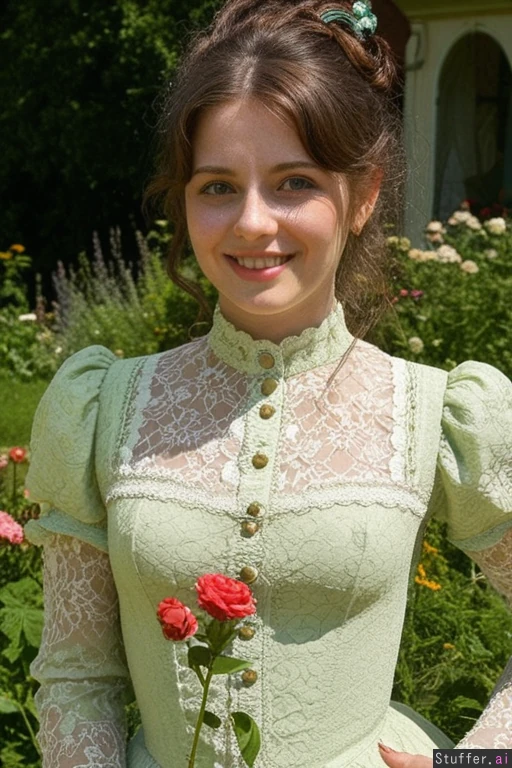 Masterpiece, best_quality, beautiful, cozy colors, , (1girl), HDR, intricate detail, sophisticated detail, detailed textures, best lighting, full color, haptic style Hyper realistic, extremely beautiful 25 year old european girl, garden full of flowers, brunette hair victorian hairstyle, green eyes, skinny, bright smile,sunny day, victorian pale green era dress,