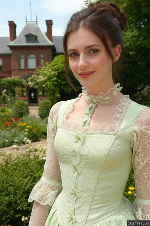 Masterpiece, best_quality, beautiful, cozy colors, , (1girl), HDR, intricate detail, sophisticated detail, detailed textures, best lighting, full color, haptic style Hyper realistic, extremely beautiful 25 year old european girl, garden full of flowers, brunette hair victorian hairstyle, green eyes, skinny, bright smile,sunny day, victorian pale green era dress,skinny face,