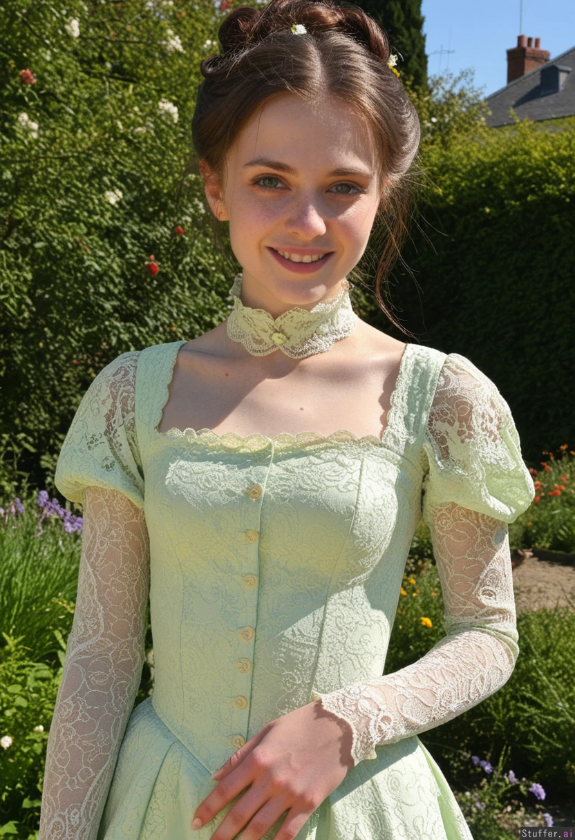Masterpiece, best_quality, beautiful, cozy colors, , (1girl), HDR, intricate detail, sophisticated detail, detailed textures, best lighting, full color, haptic style Hyper realistic, extremely beautiful 25 year old european girl, garden full of flowers, brunette hair victorian hairstyle, green eyes, skinny, bright smile,sunny day, victorian pale green era dress,skinny face,