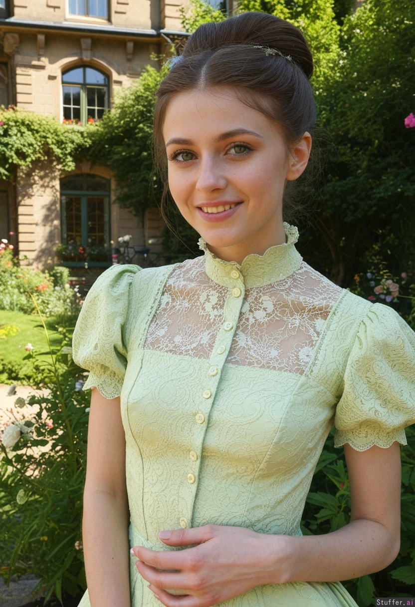 Masterpiece, best_quality, beautiful, cozy colors, , (1girl), HDR, intricate detail, sophisticated detail, detailed textures, best lighting, full color, haptic style Hyper realistic, extremely beautiful 25 year old european girl, garden full of flowers, brunette hair victorian hairstyle, green eyes, skinny, bright smile,sunny day, victorian pale green era dress,skinny face,