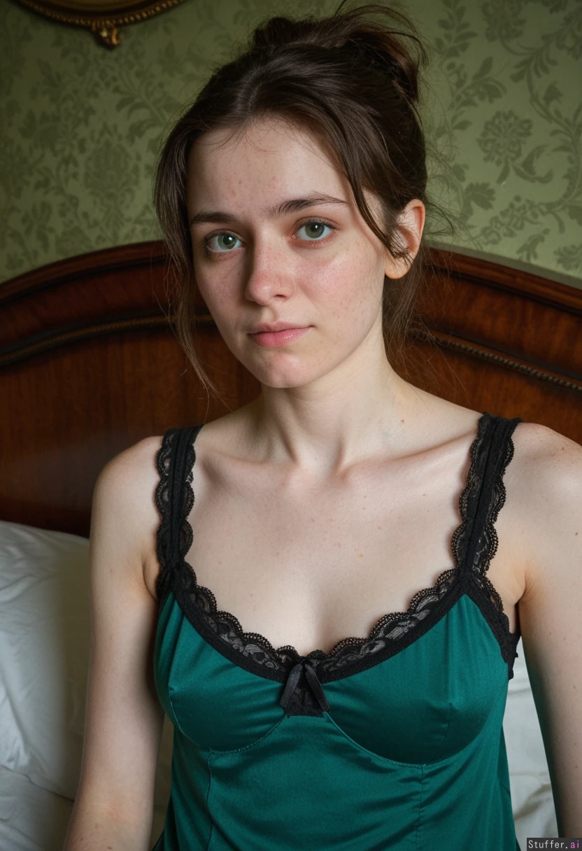 Masterpiece, best_quality, beautiful, cozy colors, , (1girl), HDR, intricate detail, sophisticated detail, detailed textures, best lighting, full color, haptic style Hyper realistic, extremely ill 29 year old european girl, victorian bedroom,dark green victorian paperwall, dark wooden bed with green bedsheeta, brunette hair victorian hairstyle,messy hair, white strands of hair, smallpox scars, dull green eyes, skinny, dull green nightgown, saggy chest, dark circle around her eyes, faint smile, ill 3.3, under her bedsheets, bedridden, sickly look, pale skin, smallpox scars 3.2, smallpox 3.1, saggy skin,