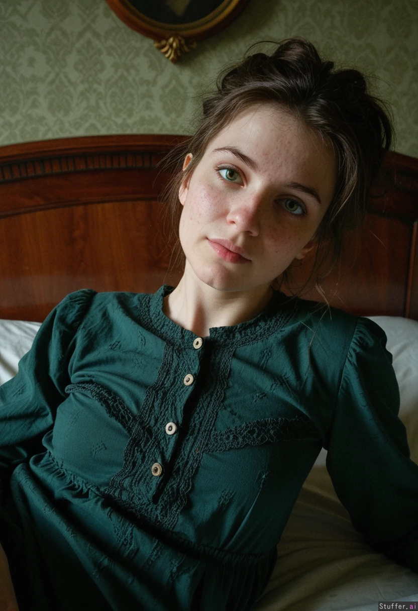 Masterpiece, best_quality, beautiful, cozy colors, , (1girl), HDR, intricate detail, sophisticated detail, detailed textures, best lighting, full color, haptic style Hyper realistic, extremely ill 29 year old european girl, victorian bedroom,dark green victorian paperwall, dark wooden bed with green bedsheeta, brunette hair victorian hairstyle,messy hair, white strands of hair, smallpox scars, dull green eyes, skinny, victorian dull green nightgown, , dark circle around her eyes, faint smile, ill 3.3, under her bedsheets, bedridden, sickly look, pale skin, smallpox scars 3.2, smallpox 3.1, saggy skin, sweat ,pale,sick,grey strands of hair,deformed by duseas 3.5,laying on her bed ubder bedsheets