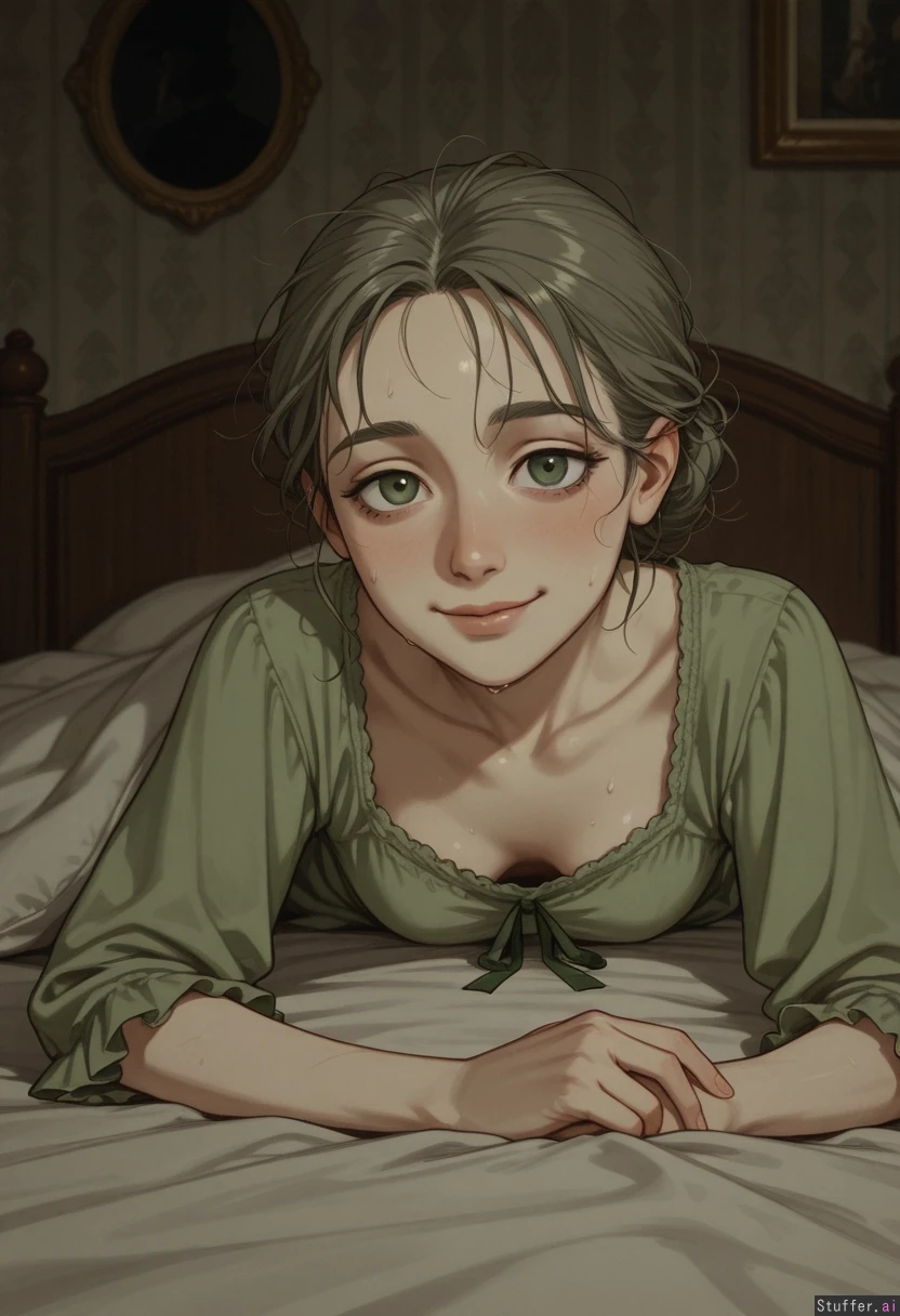 Masterpiece, best_quality, beautiful, cozy colors, , (1girl), HDR, intricate detail, sophisticated detail, detailed textures, best lighting, full color, haptic style Hyper realistic, extremely ill 29 year old european girl, victorian bedroom,dark green victorian paperwall, dark wooden bed with green bedsheeta, brunette hair victorian hairstyle,messy hair, white strands of hair, smallpox scars, dull green eyes, skinny, victorian dull green nightgown, , dark circle around her eyes, faint smile, ill 3.3, under her bedsheets, bedridden, sickly look, pale skin, smallpox scars 3.2, smallpox 3.1, saggy skin, sweat ,pale,sick,grey strands of hair,deformed by duseas 3.5,laying on her bed ubder bedsheets