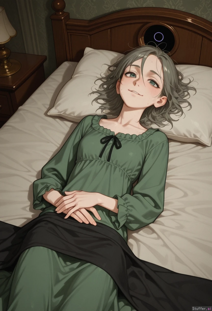 Masterpiece, best_quality, beautiful, cozy colors, , (1girl), HDR, intricate detail, sophisticated detail, detailed textures, best lighting, full color, haptic style Hyper realistic, extremely ill 29 year old european girl, victorian bedroom,dark green victorian paperwall, dark wooden bed with green bedsheeta, brunette hair victorian hairstyle,messy hair, white strands of hair, smallpox scars, dull green eyes, skinny, victorian dull green nightgown, , dark circle around her eyes, faint smile, ill 3.3, under her bedsheets, bedridden, sickly look, pale skin, smallpox scars 3.2, smallpox 3.1, saggy skin, sweat ,pale,sick,grey strands of hair,deformed by duseas 3.5,laying on her bed ubder bedsheets