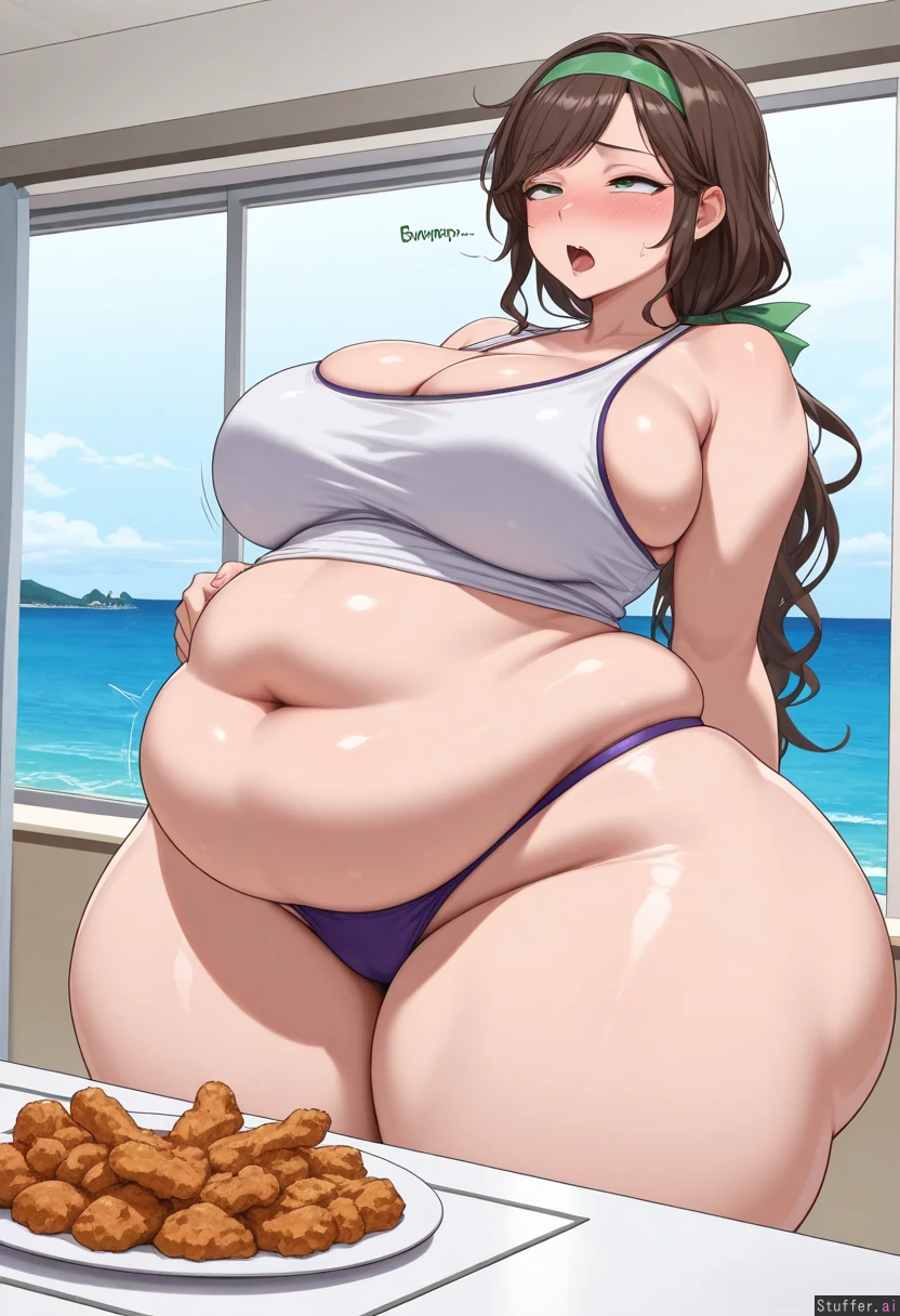 (best quality), (high rating), absurd res, high res, detailed, ultra quality, ((high quality)), masterpiece, (ultra high resolution), anime style, stunning beauty, detailed face, intricate detail, sophisticated detail, exquisite detail, absurd resolution, correct anatomy, 8k, (highly detailed face), highly detailed skin texture, 1girl, long dark brown hair, wavy hair, wind-swept bangs, green eyes, low ponytail, ((island retreat, ocean in background, pile of fried chicken on table)), embarrassed, ((((huge_hips:1.9)))), ((((massive hips)))), ((ultra_wide_hips)), ((hyper thick hips)), ((fat belly)), (embarrassed, green headband, white tank top, purple bikini bottoms), thick waist, wide hips, (huge thighs), bottomheavy, (thick thighs), chubby_belly, fat rolls, (big_belly:1.3), ((belly noises)), ((too full to move)), ((panting)), (((embarrassed))), ((belly gurgling)), ((heavy blush)), ((large breasts)), ((sloshing belly)), ((squinting, looking ahead, ahegao, tired, dizzy)), ((standing, leaning back, belly ache))), ((belly ache)), ((open mouth, moaning, burping, hiccups, embarrassed)), ((dazed, bimbo)), ((ssbbw)), ((upset belly, digesting noises)), ((side view)), ((nauseous expression)), ((round belly)), ((cleavage))