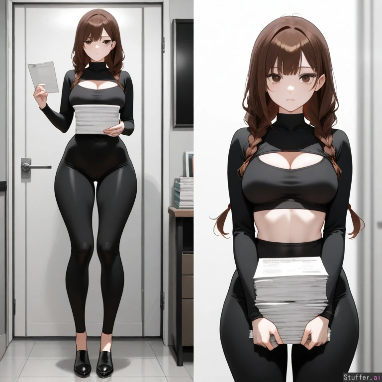 1 girl full body front facing holding stack of papers pale skin dark brown braids leggings tight black crop top round butt thick thighs skinny waist big eyes hd 4k office setting