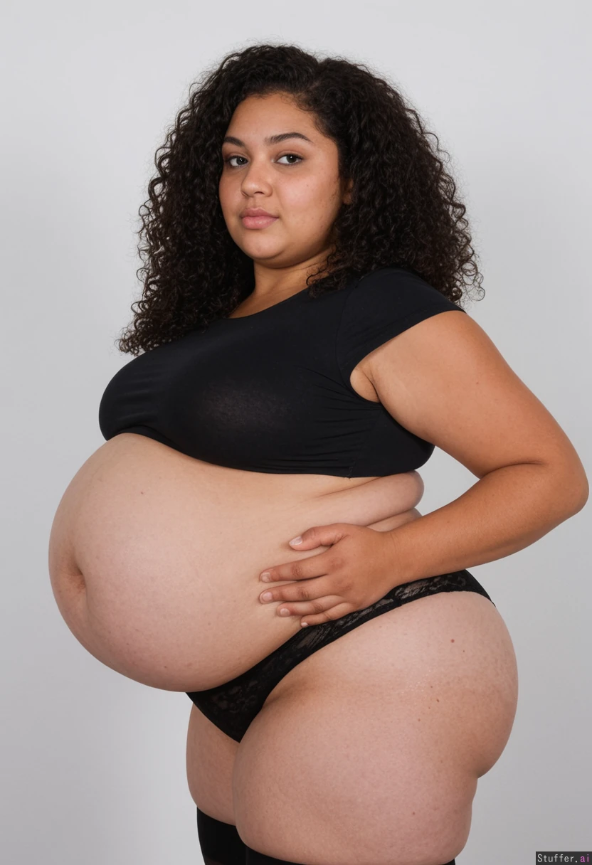 Cute massively overweight gaining hyper obese colossal engorged hefty 500 lbs German-American biracial woman in her early 20s standing in bedroom, getting dressed in the morning, becoming more and more overweight and immobile, filling out, too heavy to walk, too obese to wear clothes, leaning back, straining, rapidly fattening, rounding, enjoying weight gain, completely out of shape, lazy slob. (Swollen engorged stuffed flabby hyper blob:1.7) ((Side_view:1.8)). (Immaculate slim gorgeous ethereal model face). (Slim cute soft lean face:1.4) Upturned aesthetic nose. Wavy curly jet black hair. (Light lumpy obese discolored cellulite skin, extreme stretch marks:1.7) (Tight top, tight panties:1.8)) Narrow soft shoulders. ((Fat flabby hanging breasts:1.6)). Formerly Athletic softening curvy pudgy chunky obese lumpy lardy build. (Former athlete, butterball). Ample thick expanding soft hips, expanding round heavy massive butt. ((Heavy rapidly expanding spilling flabby loose double blob gut, overflowing enormous pendulous belly, massive belly hang, soft underbelly, rolls of flabby fat, hidden groin, extremely low heavy belly hang:1.7)), ((belly touching thighs:1.5)), ((belly touching knees:1.5)), (lumpy loose saggy swollen bulging lardy bulky fat:1.7)), massive waist line, expanding plump wide hips, ((enormous swollen fat fupa, engorged fat lardy groin:1.4)) , flabby round arms, delicate hands, delicate fingers Aroused by colossal blob body, breathing heavily, wheezing, straining due to obesity ,heavily flushed cheeks, awkward, clumsy, helpless, heavy blush Realistic, perfect anatomy. (DSLR photo).