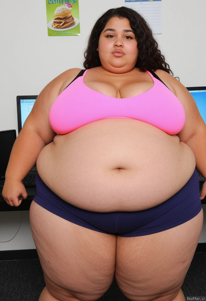 hyper_thick bottom_heavy cute hyper ultra morbidly obese African-American biracial blob woman in her early 20s, gamer girl gaining weight on purpose, ((_side_view, full_body_view)). (heaviest heftiest blob body, obese bulging spilling curves, swelling and bulging with fat, becoming more and more obese, extremely out of shape:1.5). Stunning beauty, cute, aesthetic upturned nose. Curly wavy black hair. Obese brown skin, plump lips, long round face. ((Heavy sagging bulging fat flabby heavy blob breasts, bulging voluptuous bust, jiggly absurdly soft fat engorged blob breasts bulging out on top:1.4)). ((Absurdly wide big thick ample hips, massive wide hips:1.4)), ((absurdly large squishy large thick blob thighs, flabby bulging blob arms:1.5)), (flabby heavy hanging blob belly, extreme belly_overflow, fat swollen butt:1.9), ((Sports bra, sweat shorts, fat jiggly bulging cleavage:1.7)) (Standing at desk with laptop notes and books, middle of gaming room, fast food, milkshakes, constantly snacking on fast food, messy, playful, indulgent, cute, greedy).