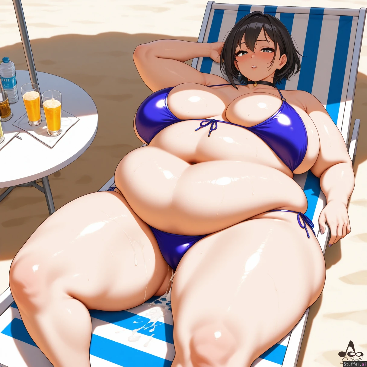 1girl, (Kanade hayami from the idolmaster cinderella girls), ((eyeliner)), choker, drunk, cum_drip, (((lounging in two beach chairs))) ((Infinote(artist)): 1.0), (((cumflation), (belly_bursting_out_of_clothes), (large_breasts), (gigantic_belly), (thick_thighs), (morbidly_obese), (love_handles), ): 1.00),