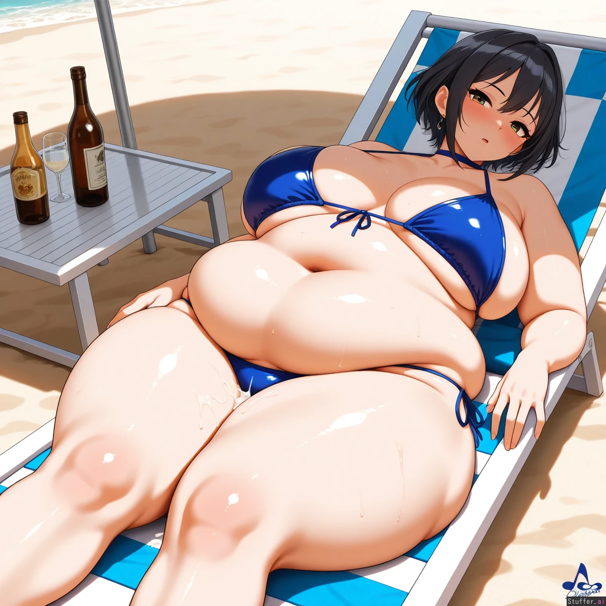 1girl, (Kanade hayami from the idolmaster cinderella girls),(yellow eyes), (black blue eyes) ((eyeliner)), choker, drunk, cum_drip, (((lounging in two beach chairs))) blue ((Infinote(artist)): 1.0), (((cumflation), (belly_bursting_out_of_clothes), (large_breasts), (gigantic_belly), (thick_thighs), (morbidly_obese), (love_handles), ): 1.00),