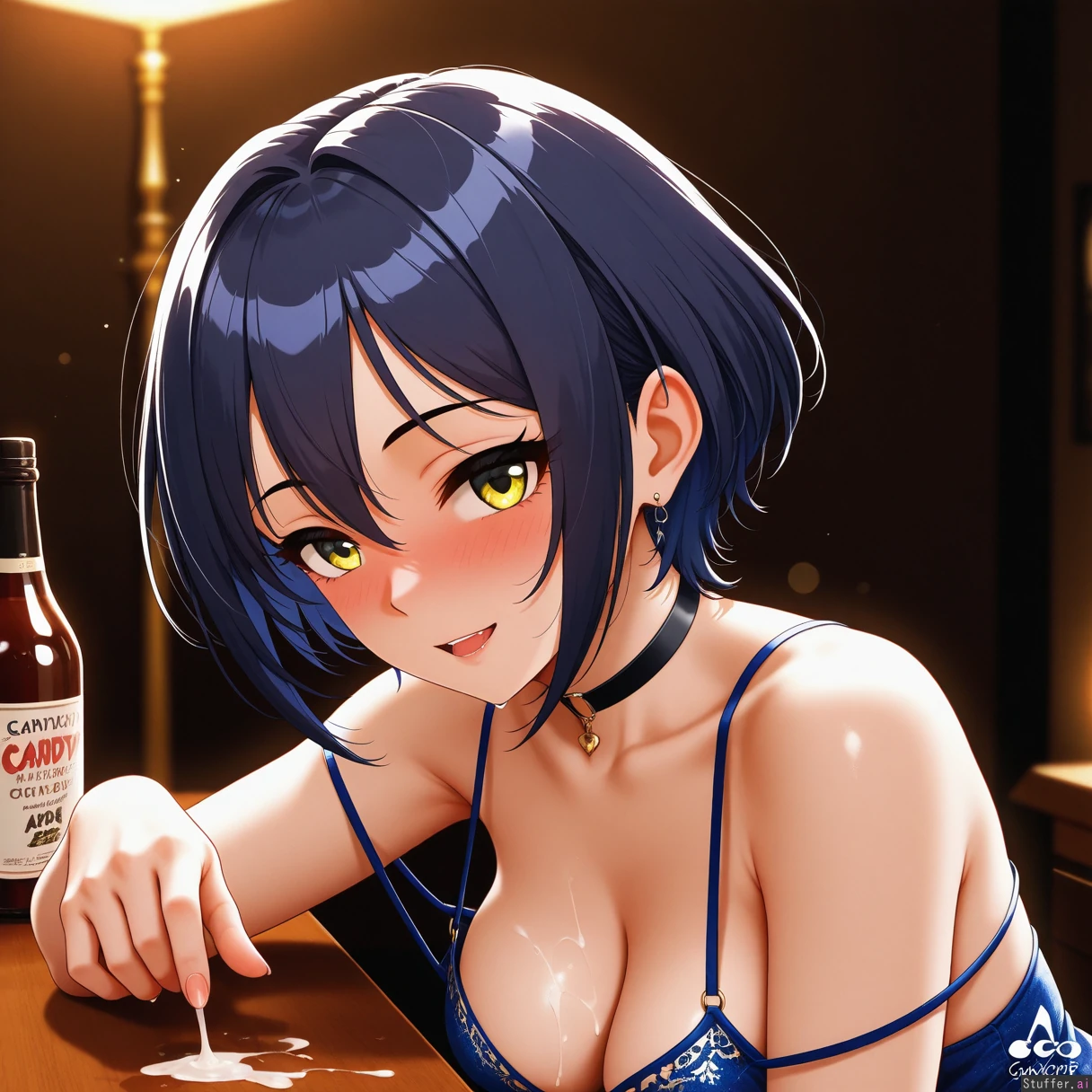 1girl, (Kanade hayami from the idolmaster cinderella girls),(bright yellow eyes), (blue black hair) ((eyeliner)), choker, drunk, cum_drip, (((CANDYLAND))) blue ((Infinote(artist)): 1.0),