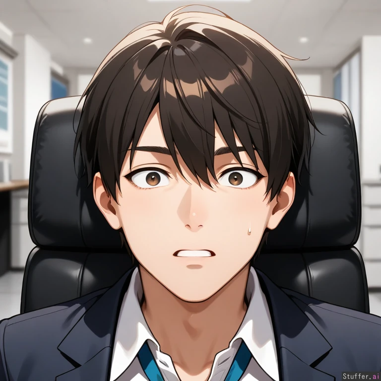 closeup image of a man with a surprised look on his face sitting in a office chair in a office room