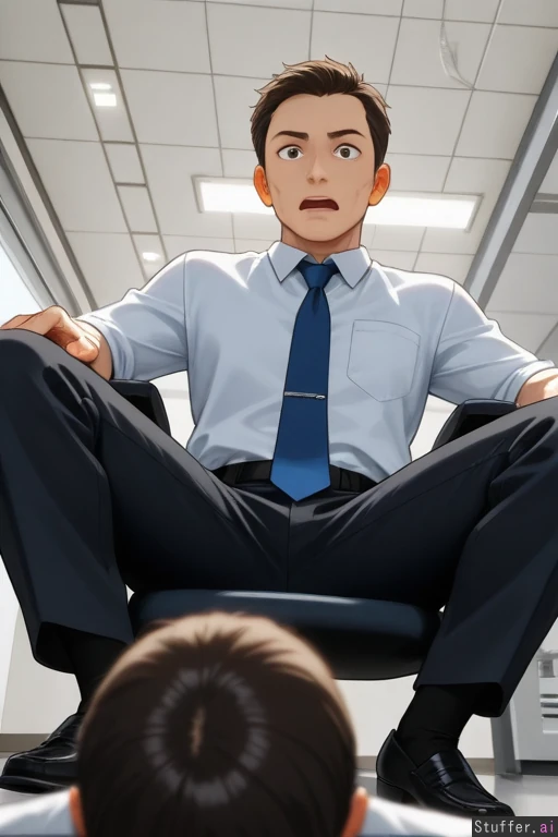 wide angle image of a older man with a surprised look on his face sitting in a office chair in a office room