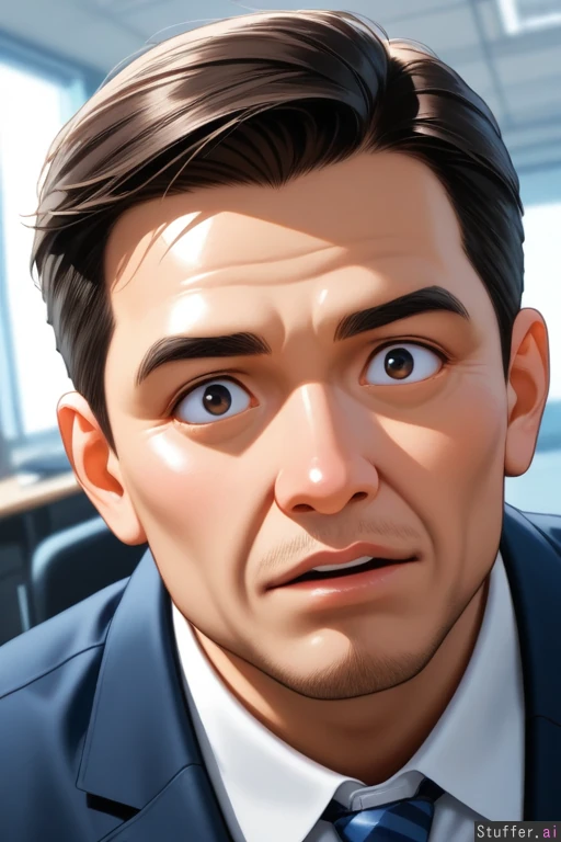 wide angle image of a older man with a surprised look on his face sitting in a office chair in a office room